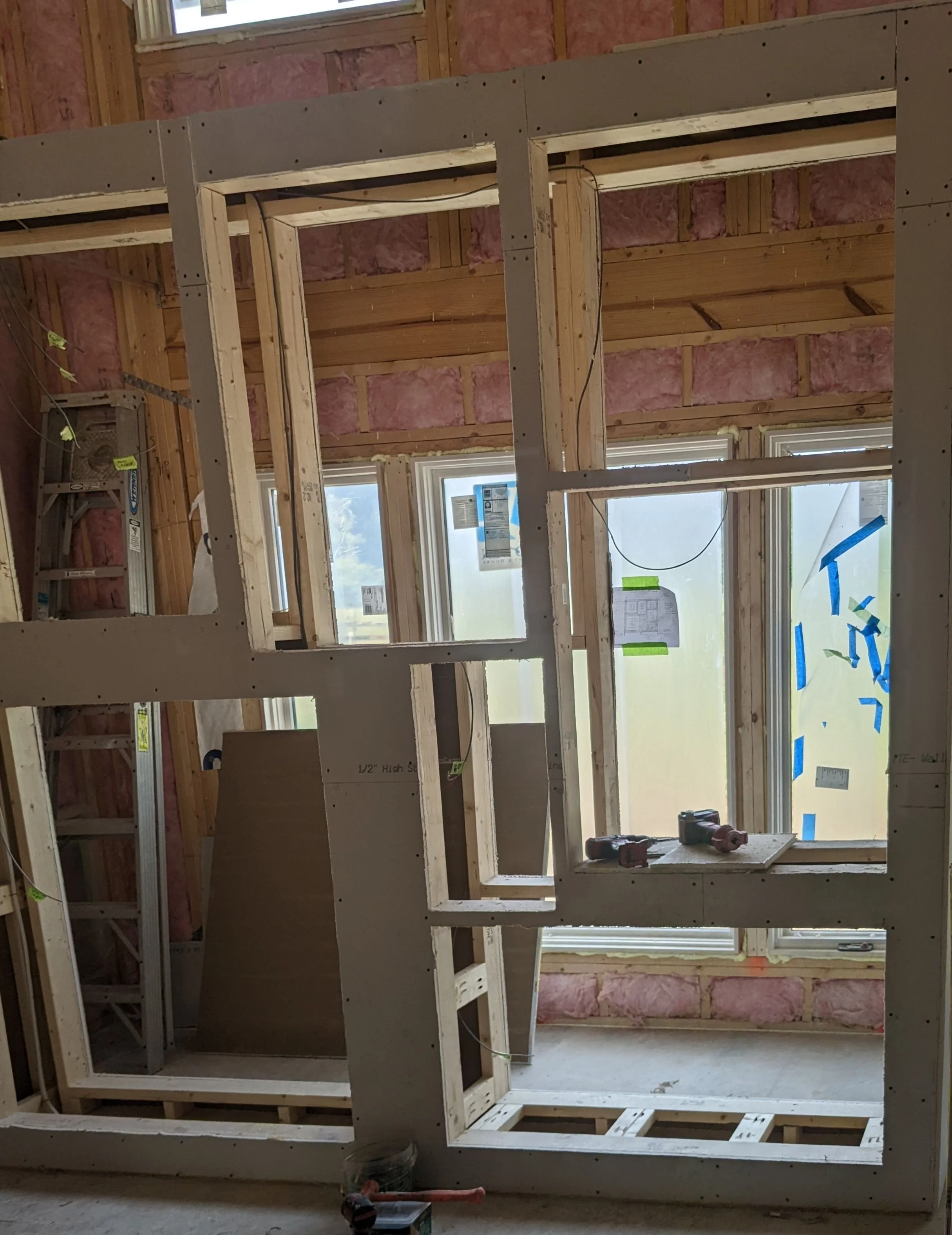 The construction process was both exciting and meticulous. After framing the wall and installing the drywall, I carefully cut out spaces for the pass through shelves, ensuring they were at the right height for both aesthetics and accessibility. I then finished the drywall, sanding and priming to create a flawless surface for painting.