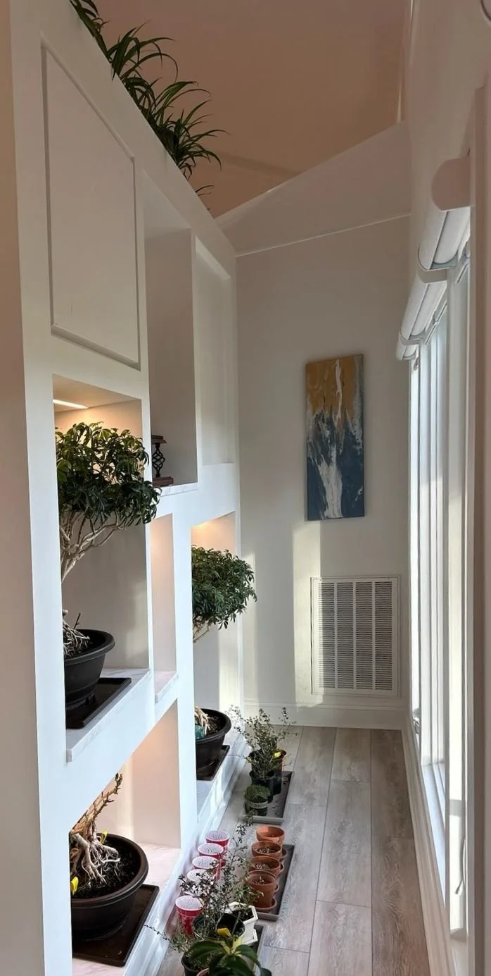 For the construction, we opted for drywall to achieve a clean, modern look. This choice provided a versatile backdrop, allowing the colors of the paintings and the lush greenery of the bonsai trees to pop. We also included a small LED lighting system to enhance the display, ensuring that the art and plants would be beautifully illuminated, especially in the evenings.
